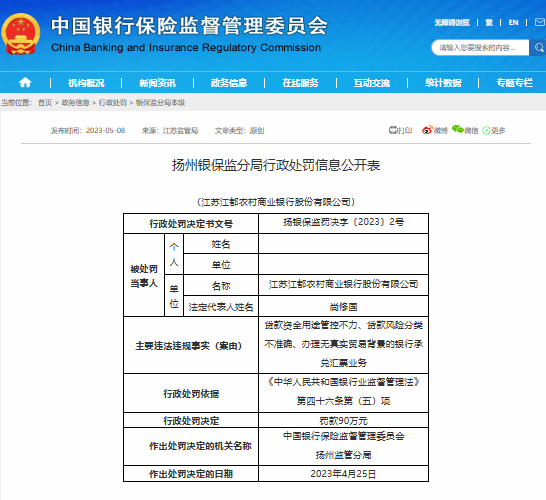 其中,江苏江都农村商业银行被开出90万元罚单,因其贷款资金用途管控不力、贷款风险分类不准确、办理无真实贸易背景的银行承兑汇票业务。相关责任人朱敏被警告,罚款6万元;郑宇被警告,罚款6万元;王科被警告,罚款5万元。