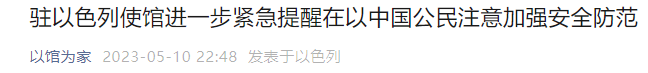 5月10日,中国驻以色列大使馆微信公众号“以馆为家”发布紧急提醒: