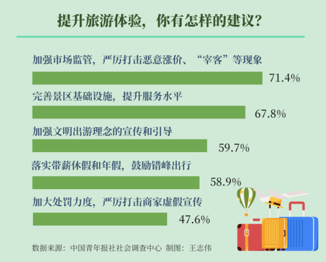 调查显示,提升旅游体验,71.4%的受访青年呼吁加强市场监管,严厉打击恶意涨价、“宰客”等现象,67.8%的受访青年建议完善景区基础设施,提升服务水平。其他还有:加强文明出游理念的宣传和引导(59.7%),落实带薪休假和年假,鼓励错峰出行(58.9%),加大处罚力度,严厉打击商家虚假宣传(47.6%)。
