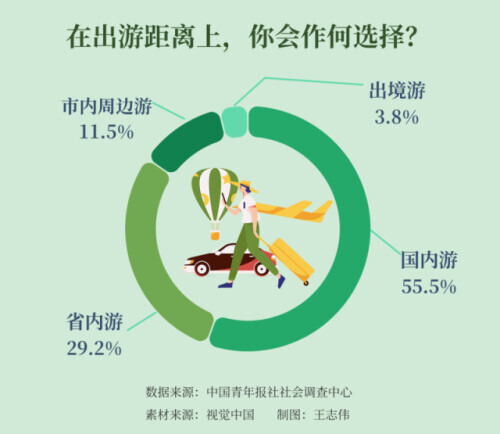 在出游距离上,年轻人更喜欢国内长途游,获选率超过五成,其次是省内中程游(29.2%)。