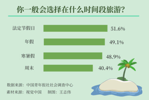 从总体来看,法定节假日仍是受访青年旅游的首选时间,获选率为51.6%,之后是年假(49.1%)、寒暑假(48.9%)以及周末(40.4%)。
