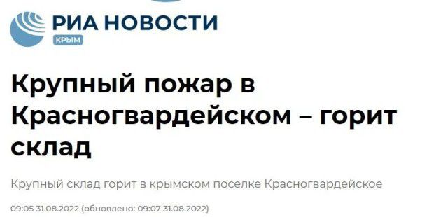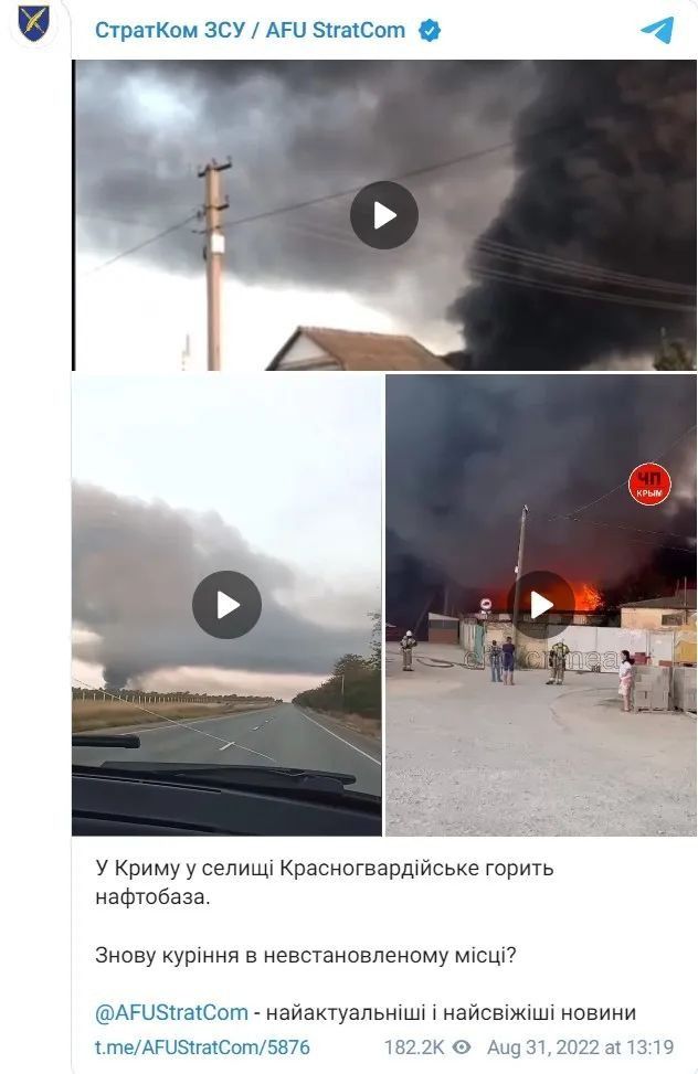 在谷歌用英语、俄语、乌克兰语检索相关信息,乌克兰武装部队战略通信部的电报频道曾在2022年8月31日发布相同视频,并称克里米亚地区一个村庄的油库着火了。不过,俄罗斯方面的通告与之略有出入,俄新社援引俄罗斯紧急情况部门的消息表示,火灾发生在一个仓库内,没有造成人员伤亡。但可以肯定的是,网传视频并非近日拍摄。
