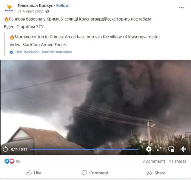 使用InVID视频工具截取网传视频关键帧并在Yandex进行反搜,结果显示,该视频最早可见于2022年8月31日,有脸书和推特用户在附文中写道,克里米亚地区的一个油库着火。