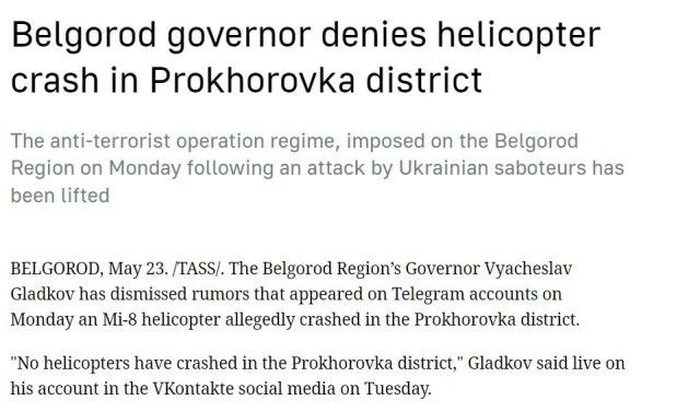 另一方面,据塔斯社5月24日报道,别尔哥罗德州州长维亚切斯拉夫·格拉德科夫(Vyacheslav Gladkov)反驳了在电报频道上盛传的谣言,表示“没有直升机在普罗霍罗夫卡地区坠毁” 。报道中还提到,州长早些时候警告称,“乌克兰发起了前所未有的信息攻势”,他敦促当地居民只相信当地的官方信息。