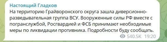 5月22日,别尔哥罗德州州长发布电报称,“乌克兰武装部队的一个破坏和侦察小组进入了格赖沃龙地区(Grayvoron)。俄罗斯联邦武装部队与边防局、俄罗斯护卫队和联邦安全局一起,正在采取必要措施消灭敌人。”而乌克兰军事情报局发言人则对此表示,“由俄罗斯联邦公民和‘俄罗斯自由军团’组成的俄罗斯志愿军发起了一项行动,旨在解放别尔哥罗德州的某些地区,并击退俄罗斯军队。他们想通过这个行动建立一个安全区来保护乌克兰平民。”