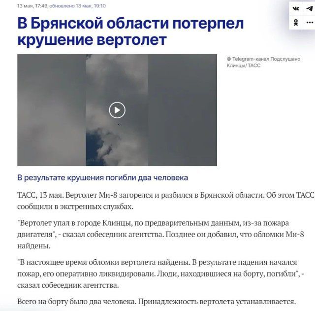 而除此之外,本月确有俄罗斯米-8直升机坠毁事故发生。据塔斯社5月13日援引俄罗斯紧急情况部门消息,一架米-8直升机在俄罗斯布良斯克州克林茨市郊区坠毁,坠毁原因是直升机发动机起火,机上2人死亡。