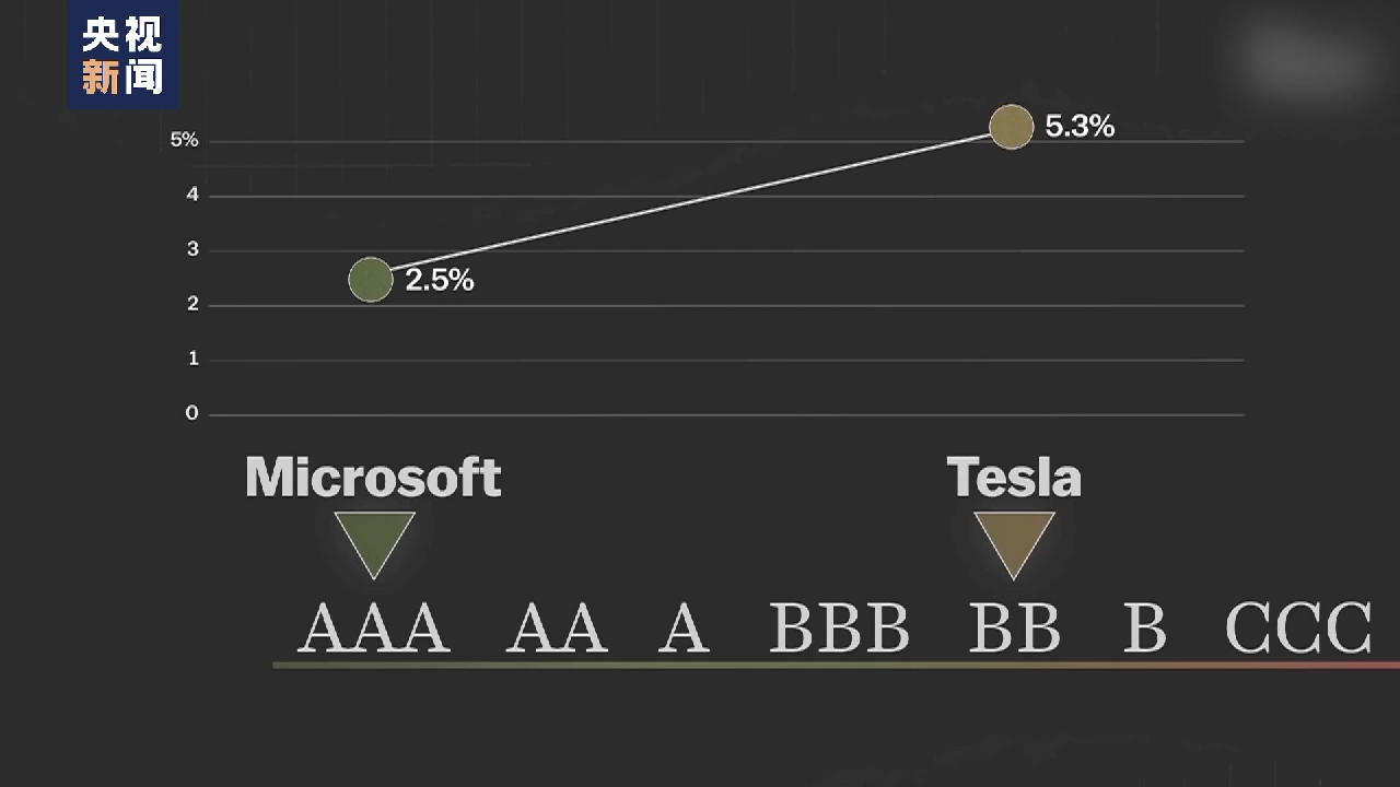 这是一个根据公司偿还债务能力高低所做出的评级表。打个比方,微软因长期按时支付员工薪酬,拥有最高的评级AAA。而特斯拉只拥有BB评级。评级不同,也影响到他们债务的利率不同。微软的借款利率为2.5%,而特斯拉的借款利率则高达5.3%。也就是说,评级风险越大,借款利率就越高。