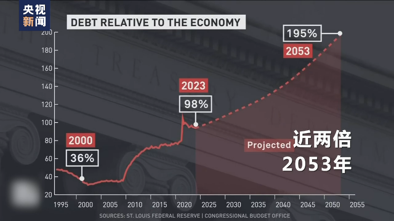 据美国公共广播公司报道,23年前的2000年,美国国债相当于当年美国GDP的36%。如今美国国债则相当于全年GDP的98%。更糟糕的是,如果不对这一趋势加以控制和改变,30年后的2053年,美国联邦债务预计将飙升至GDP的近两倍。