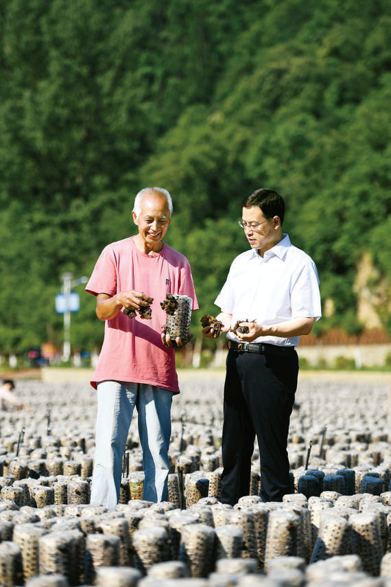 陈璇(右)在金米村调研柞水木耳长势情况。