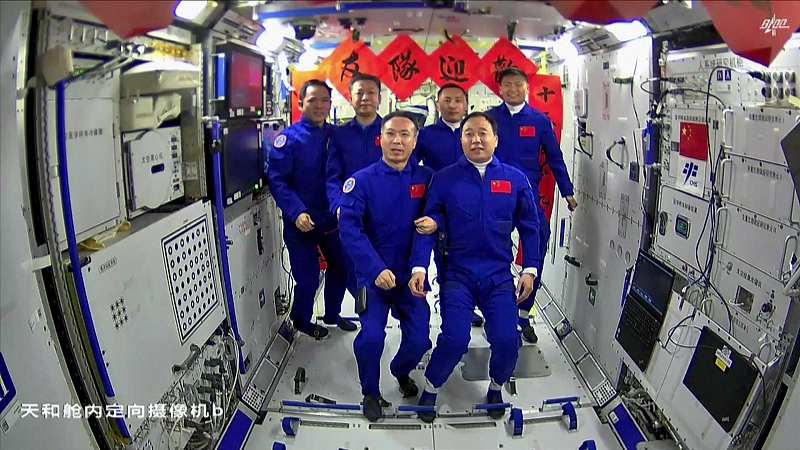 5月30日18时22分,翘盼已久的神舟十五号航天员乘组顺利打开“家门”,欢迎远道而来的神舟十六号航天员乘组入驻“天宫”。(图源:CCTV+)