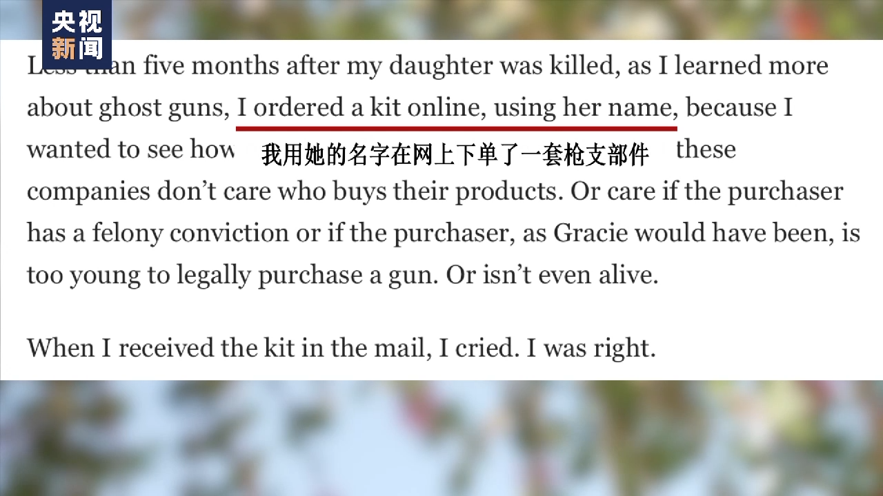 “幽灵枪”校园枪击案幸存者 米娅·特雷塔:当时我们正在谈笑,突然听见“砰”的一声枪响,当第二声枪声响起时我已经跌倒在地上。我爬起来,跑进教室里,同学和老师急忙为我止血,我被一名不认识的同校学生,同时也是一个未成年人,用一把点45口径的“幽灵枪”击中了。