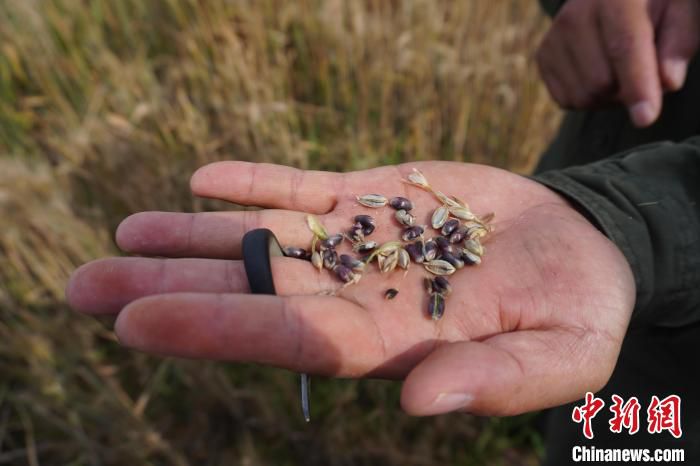 中新网新乡6月8日电 (经晓佳 韩章云)用随身携带的剪刀从麦田里剪一个麦穗,手掌一搓,吹去麦壳,颗粒圆润饱满的紫红色麦粒落在刘海富的掌心。