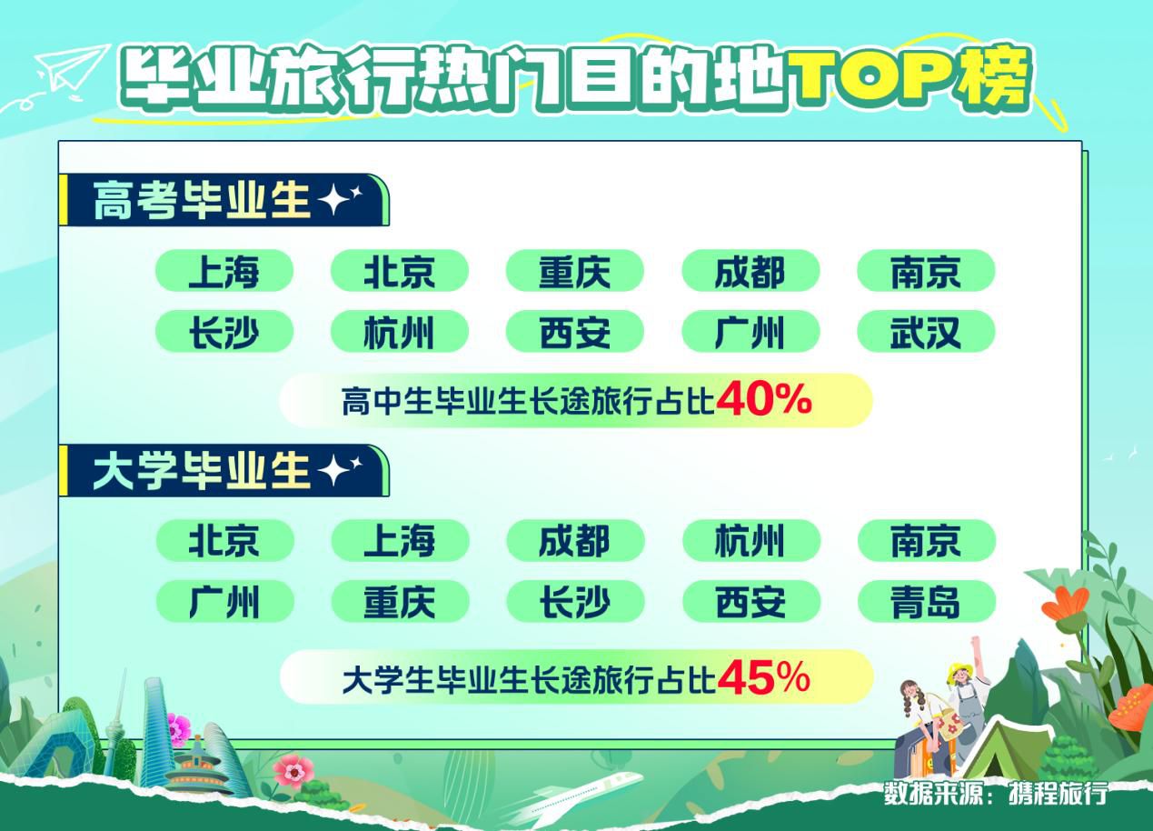 虽然高考成绩还没出来,但选择国内长途旅行的毕业生依旧不少。携程数据发现,高考毕业生预订长途旅游的比例为40%;选择走得更远的大学毕业生更多一些,长途游占比达到45%。