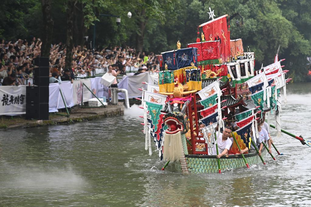 一时间浪花飞溅、鼓乐激昂。众人的惊呼中,一艘独特的龙舟闯入视线,原来是杭州亚运会吉祥物“琮琮”“莲莲”“宸宸”乘坐着龙舟加入竞渡队伍。