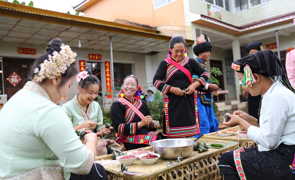 长桌上的粽子连成串,长桌旁的村民心贴心。端午节当天,云南省沧源佤族自治县勐角乡勐甘村的佤族、傣族、彝族、拉祜族等族群众齐聚一堂,包香粽、过端午。