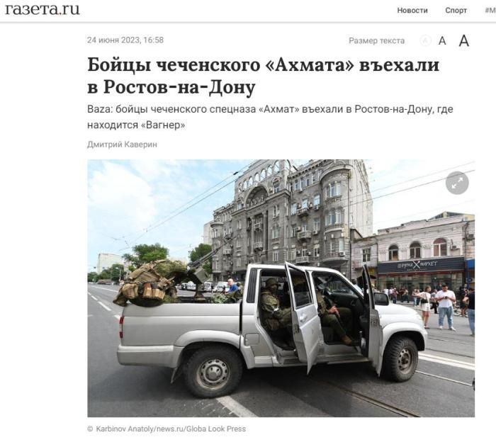 中新网6月24日电 据俄罗斯《报纸报》援引社交媒体消息,当地时间24日,俄罗斯车臣“阿赫马特”特种部队已进入顿河畔罗斯托夫地区。当日早间,俄雇佣兵组织“瓦格纳”集团进入该地。