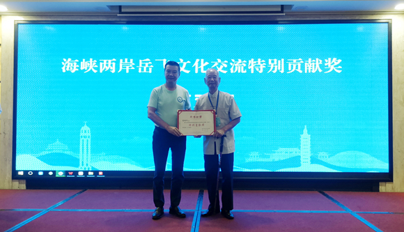 岳朝军为高双印颁发“海峡两岸岳飞文化交流特别贡献奖”荣誉证书。华龙网-新重庆客户端记者 杜典韵 摄