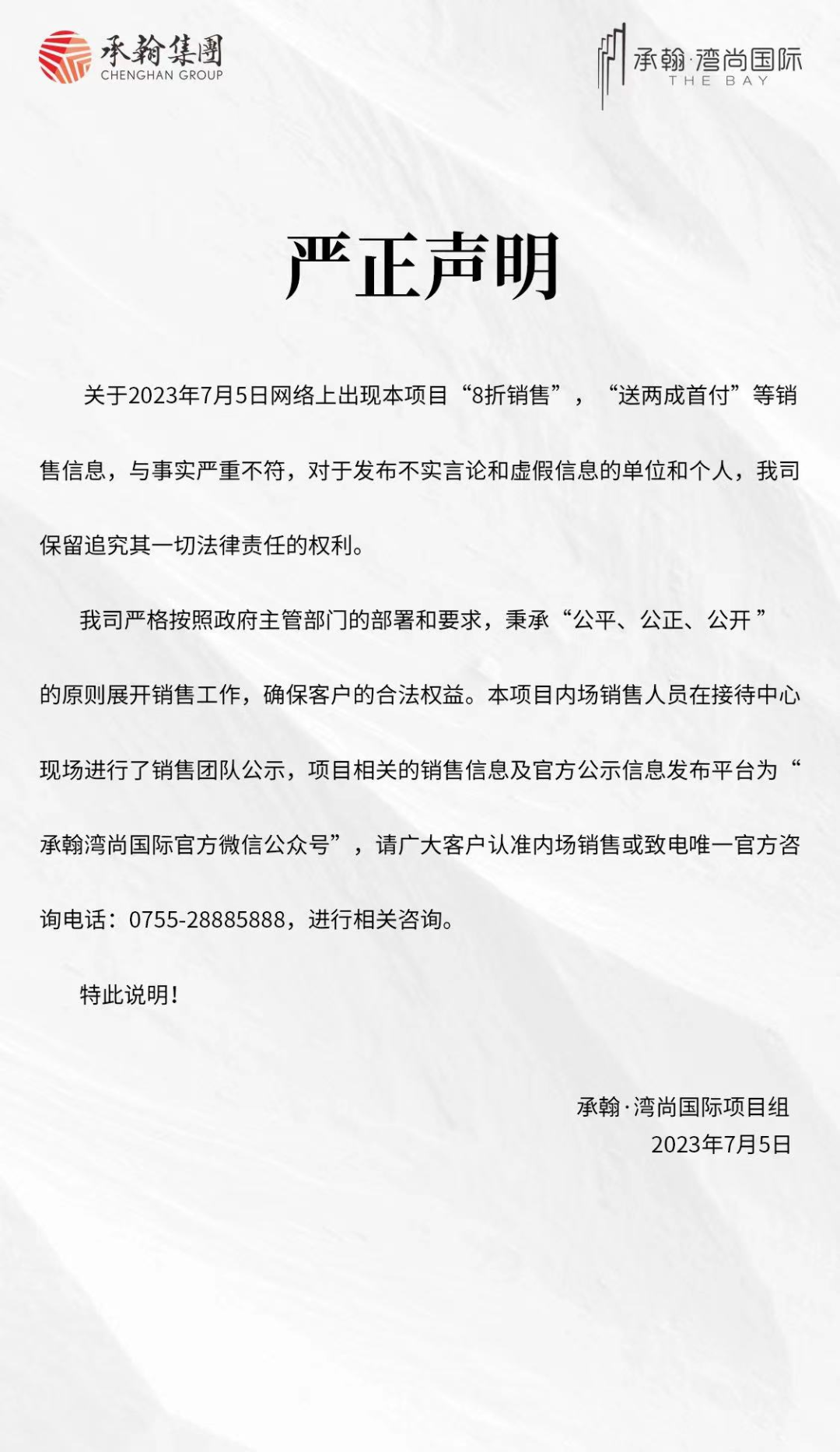 记者注意到,承翰湾尚国际官微发布了一则严正声明,声明提到“8折销售”“送两成首付”等销售信息与事实严正不符。不过,就在7月6日和7日,仍有不少房产中介经理对外以“8折销售”“送两成首付”等字眼对外进行宣传。