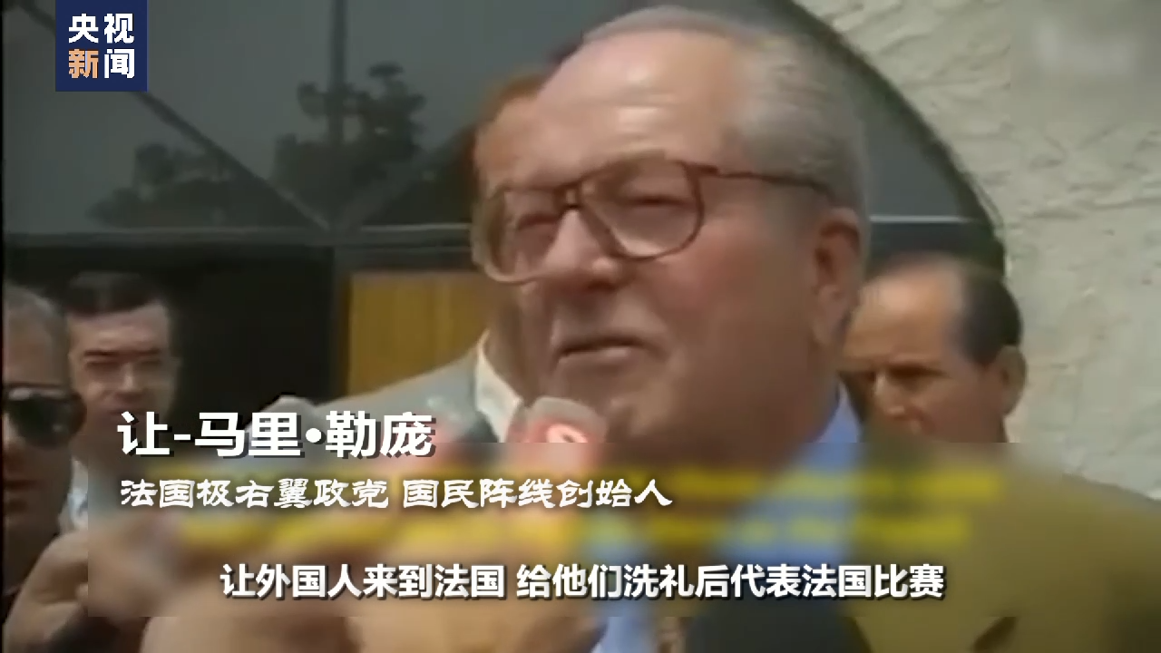 法国极右翼政党 国民阵线创始人 让-马里·勒庞:我觉得这是造假,让外国人来到法国,给他们洗礼后代表法国比赛。我注意到其他国家的球员,在高唱国歌时比我们的球员赤诚得多。事实上,大多数法国队的球员根本没有开口唱歌,可能他们不知道歌词是什么。