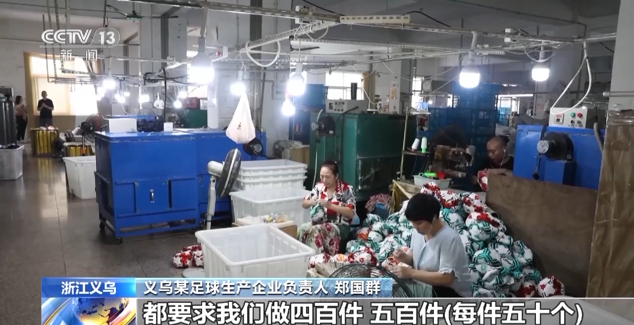 义乌某足球生产企业负责人 郑国群:义乌是个窗口,保持在这里,我们外省有一些加工合作工厂在那里,单子分流出去,往年工厂生产少的,今年也叫他们增加产量,因为单子消化不完。