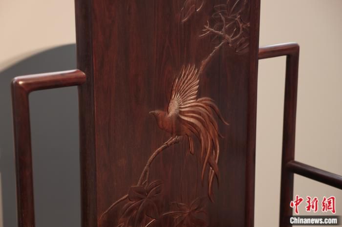 “这个椅型,最早起源于佛教禅坐,敦煌莫高窟壁画里就有这个椅子的雏形。同时我又参考了《韩熙载夜宴图》里的靠背椅,创作出了这套以天堂鸟为题材的《祥瑞》。这是南太平洋文化与中国文化交流、文明互鉴的作品。”