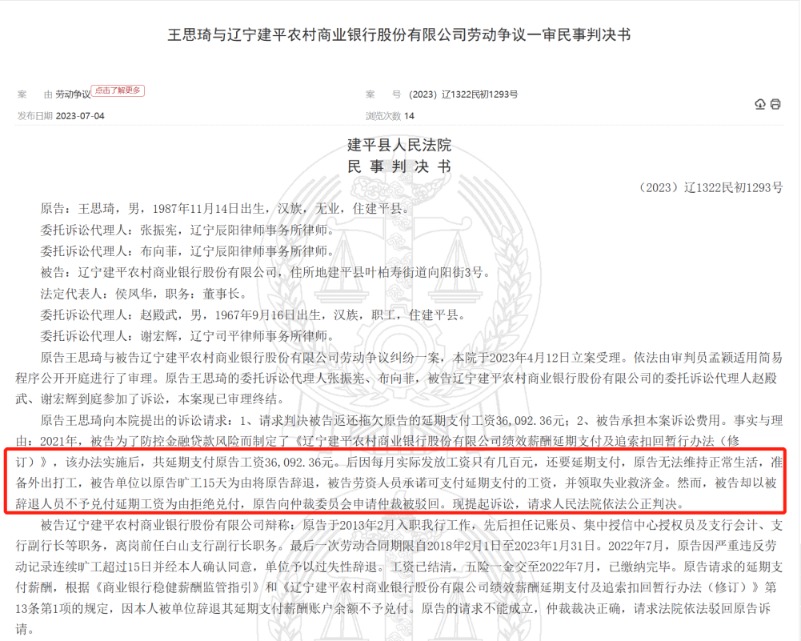 近日,裁判文书网披露了一份有关辽宁建平农商行劳动争议的一审民事判决书:该行前任某支行副行长王某因绩效薪酬延期支付,每月仅能拿到几百元,准备外出打工,被单位以旷工15天为由辞退。