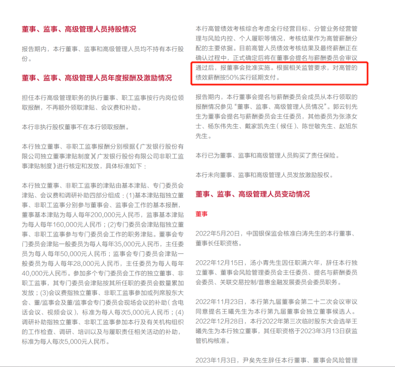 从2022年财报看,多数银行均已完成绩效薪酬延期支付相关制度。其中,中国银行、交通银行、华夏银行等将按照承担重大风险和风险管控职责人员绩效薪酬的40%以上进行延期支付;民生银行、广发银行等绩效薪酬延期支付比例不低于50%。