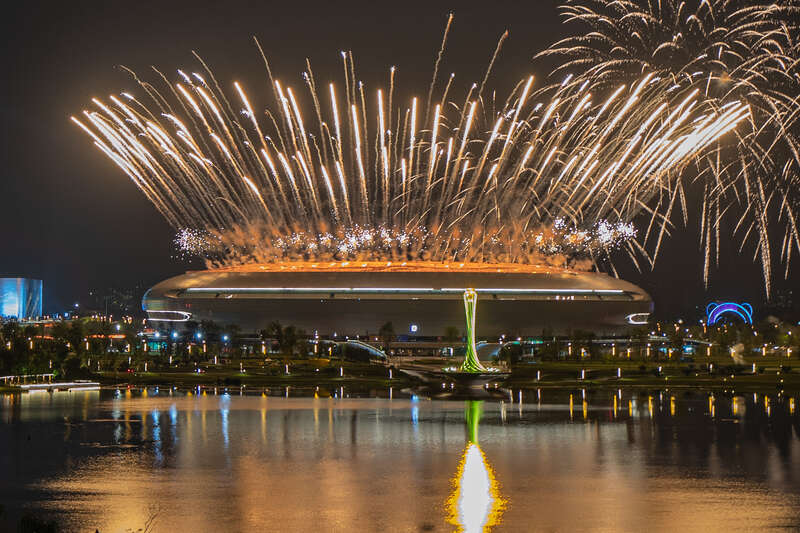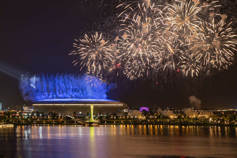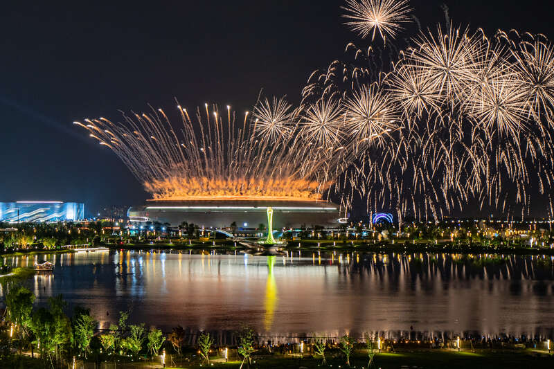 中国青年报客户端讯(汪龙华)近日,成都第31届世界大学生夏季运动会举行开幕式焰火彩排。成都大运会主火炬塔与焰火一起倒映在东安湖的水面上,照亮了夜空。