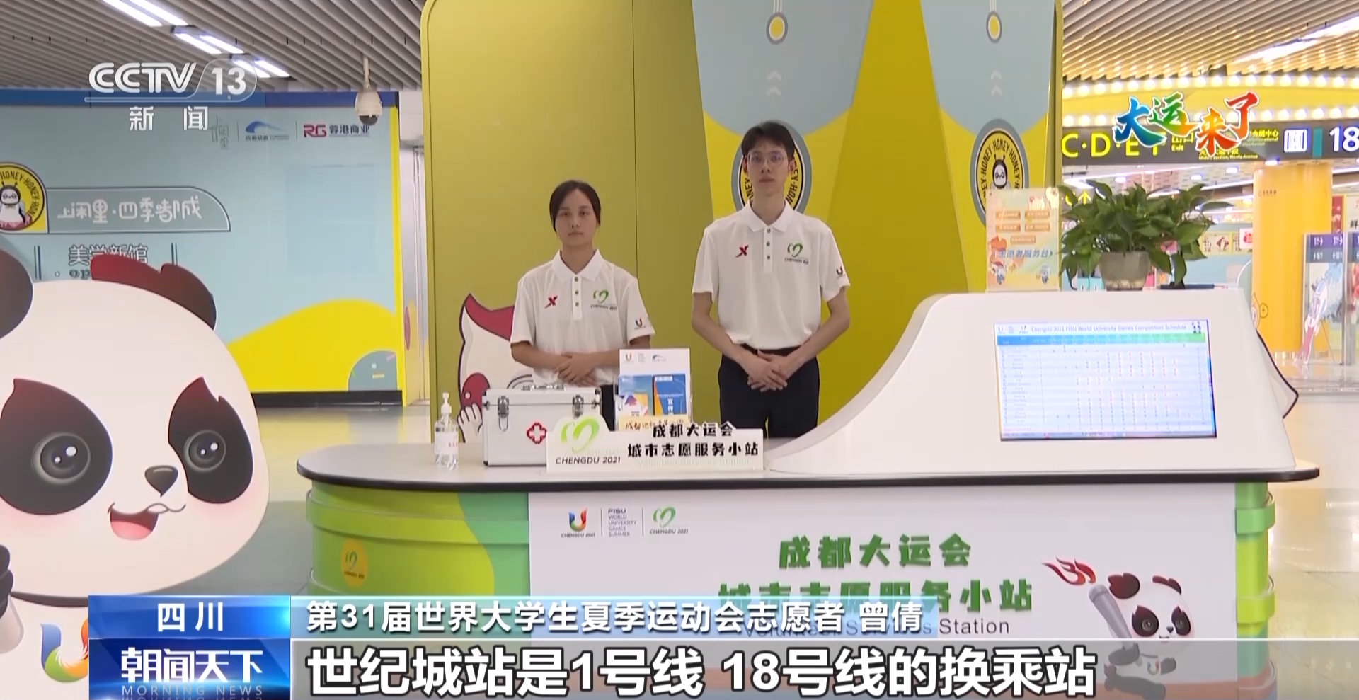 第31届世界大学生夏季运动会志愿者 曾倩:世纪城站是1号线、18号线的换乘站,平时的客流量比较大,为了让大家更好地了解大运会、走进大运会。我们提供了一些大运会的咨询服务。成都是一座著名的旅游城市,为了让大家更好地坐地铁、玩成都、游成都,我们提供了乘车指引——成都地铁美景地图。