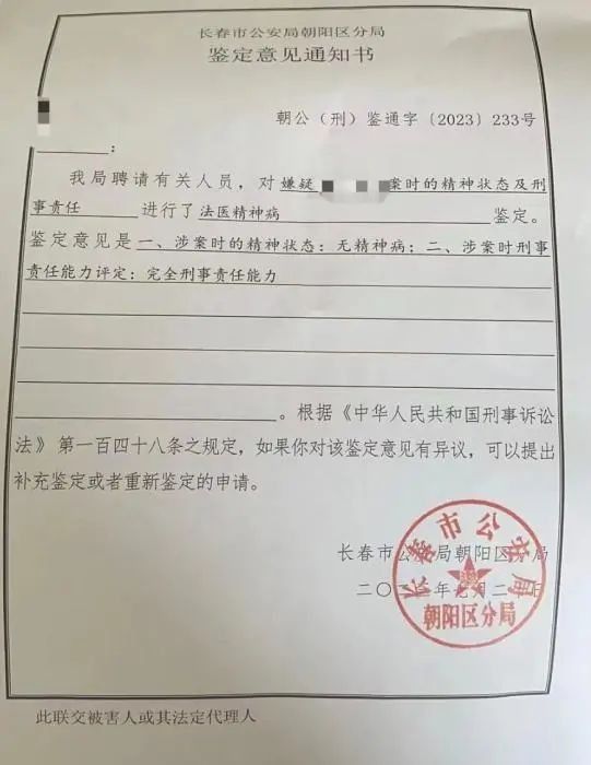 7月24日,被害人家属娄女士向中新网提供了一份警方出具的鉴定意见通知书,其中显示,嫌疑人涉案时无精神病,涉案时刑事责任能力评定为完全刑事责任能力。