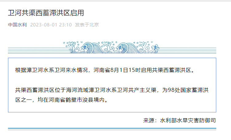 河南备战强降雨丨鹤壁市浚县卫河共渠西蓄滞洪区启用 2023-08-01水利部水旱灾害防御司 根据漳卫河水系卫河来水情况,河南省8月1日15时启用共渠西蓄滞洪区。 共渠西蓄滞洪区位于海河流域漳卫河水系卫河共产主义渠,为98处国家蓄滞洪区之一,均在河南省鹤壁市浚县境内。网页截图 编辑:王晓颖