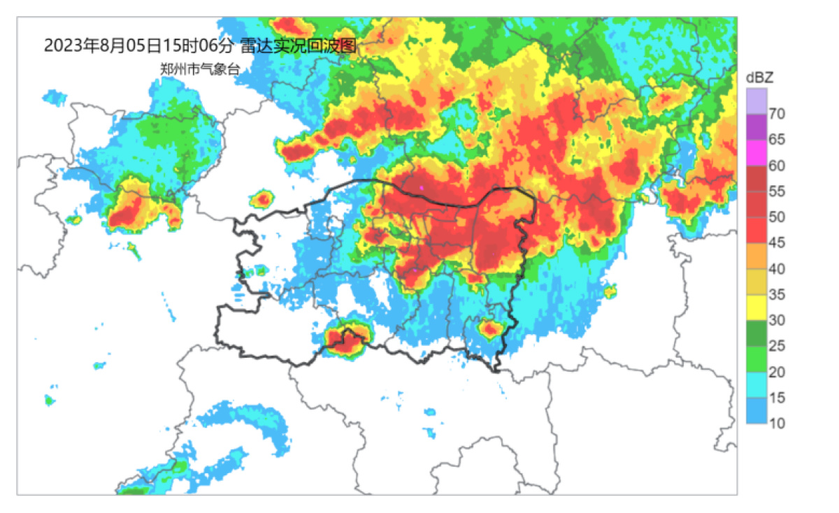 大河报·豫视频记者从郑州市气象局了解到,2023年08月05日15时06分,登封市、管城回族区、中原区、金水区、高新区、二七区、郑东新区、惠济区、经开区、中牟县、航空港区、新密市、荥阳市、新郑市有降水回波,最大回波强度56-61dBZ。