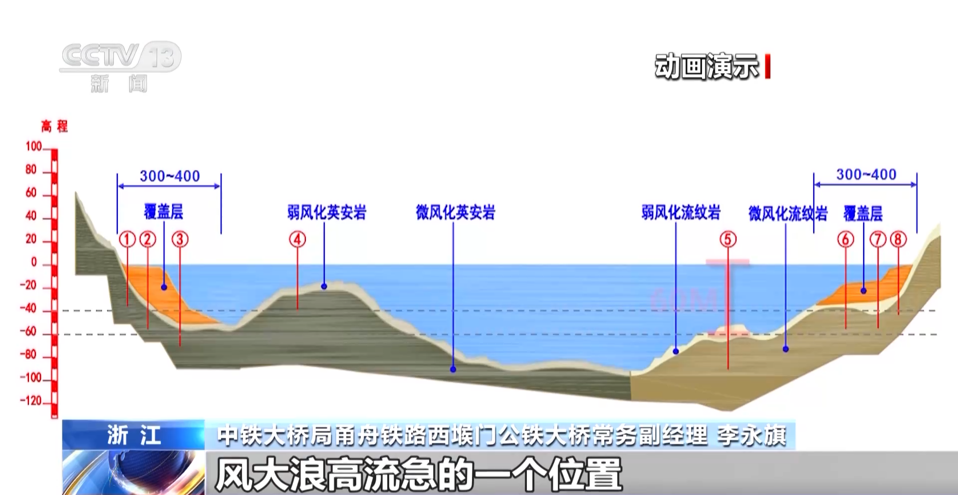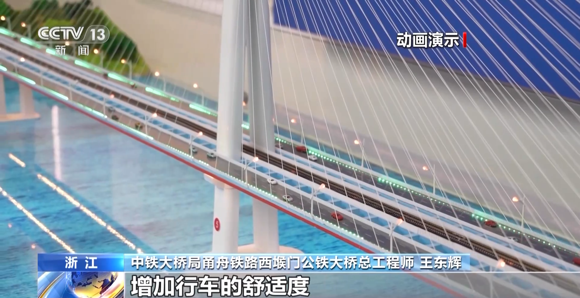 中铁大桥局甬舟铁路西堠门公铁大桥总工程师 王东辉:这座桥是处在西堠门水道的峡口,每天的风特别大,尤其是到了冬天季风季节,每天都有六七级的风。桥梁宽了以后,抗风效果特别好,稳定性特别好,增加行车的舒适度。