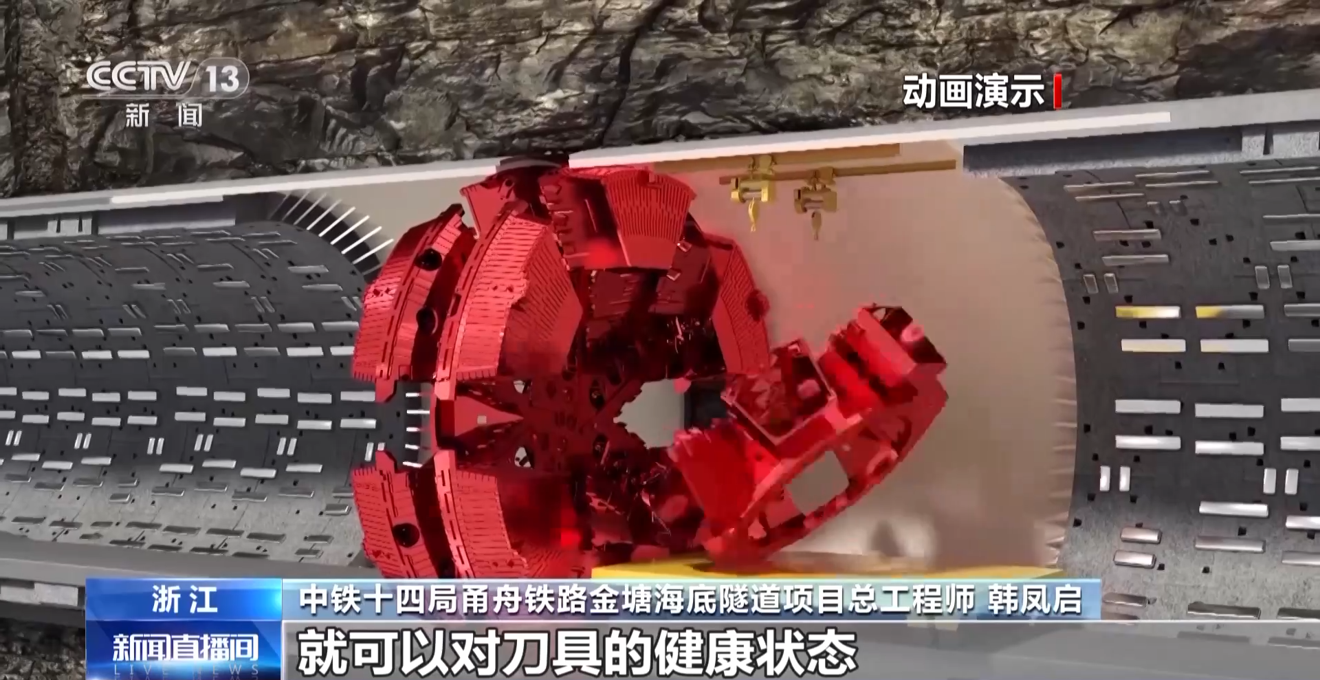 中铁十四局甬舟铁路金塘海底隧道项目总工程师 韩凤启:我们在世界范围内首次研发采用先进的滚刀智能监测系统,在盾构机驾驶室就可以对刀具健康状态进行实时监测,对刀具进行及时更换,确保盾构掘进的安全和高效。