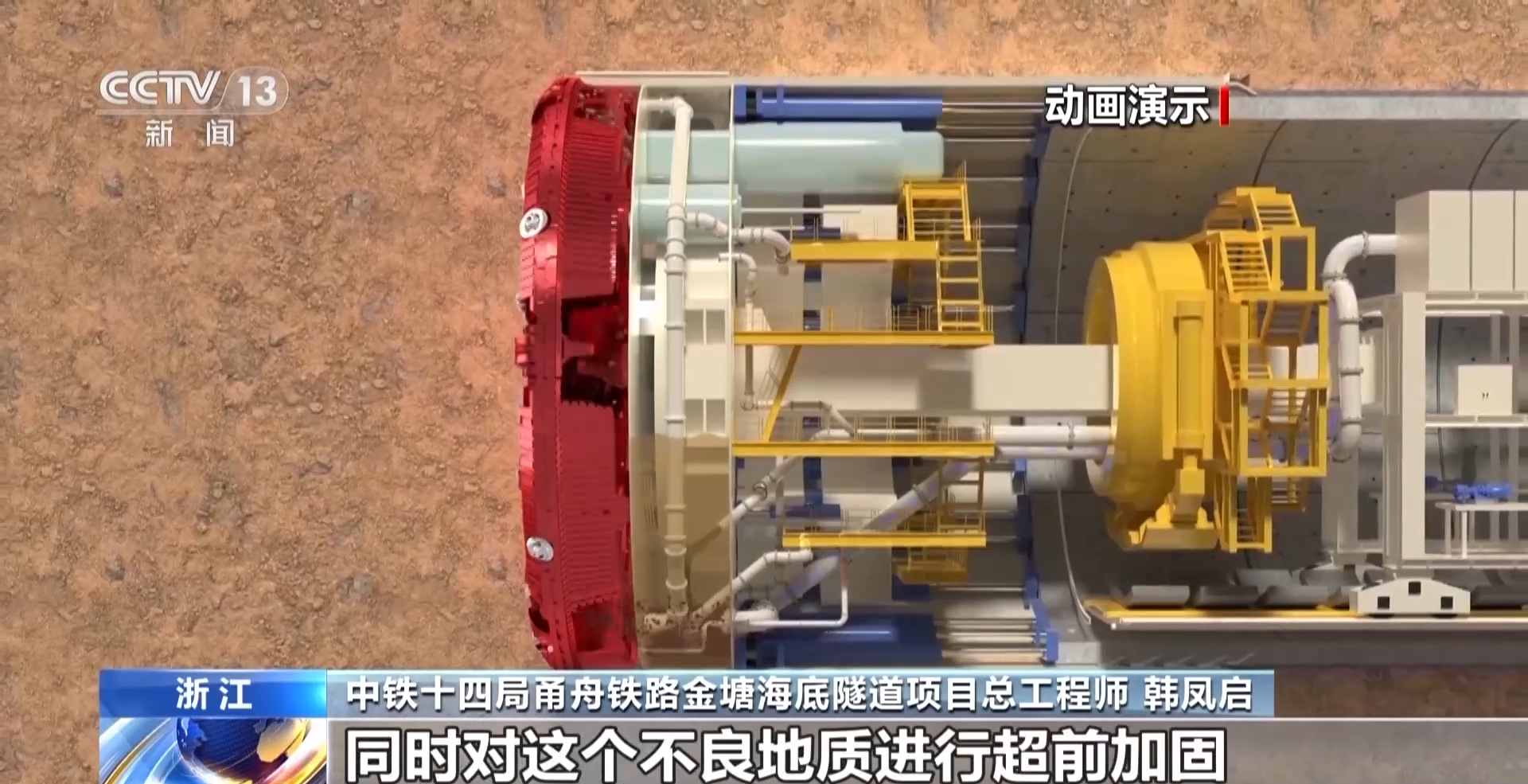 中铁十四局甬舟铁路金塘海底隧道项目总工程师 韩凤启:我们在盾构机上应用了精度最高、技术最先进的导向系统,作为盾构掘进的“眼睛”,同时在盾构机上配备了智能化设备,对盾构前方的不良地质进行超前探测,同时对不良地质进行超前加固,保证对接过程的安全。