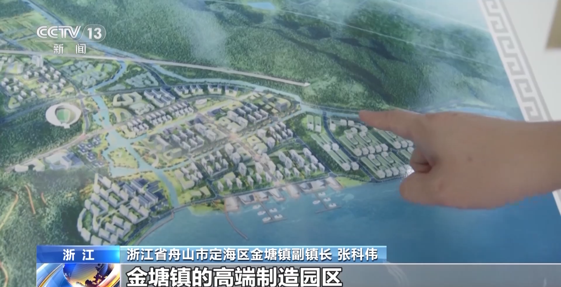 浙江省舟山市定海区金塘镇副镇长 张科伟:这张图就是我们金塘镇的规划建设图。甬舟高铁进来以后的第一站,这个位置就是我们在规划建设金塘镇的高端制造园区。目前金塘镇有一些发展旅游的规划,高铁修建后,可以吸引更多游客来金塘打卡,以前是大家高速就直接走了,现在高铁站建设后,人留住了,本地居民的旅游收入增加了,家乡更有吸引力了,会有更多的年轻人回乡创业。