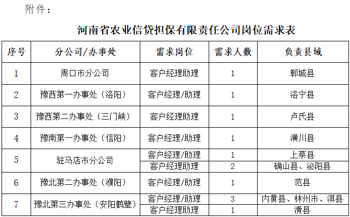 1.全日制本科及以上学历,且所学专业为金融、经济、财务、农业等相关专业;2.3年以上信贷担保、银行信贷、创业投资、投资银行工作经验,35周岁以下;3.能够长期在县级区域办事处任职,并愿意服从单位安排,同意在区域办事处间进行调配;4.具备一定的市场开拓能力,能独立进行项目调查并撰写调查报告;5.有一定写作功底,组织协调和沟通能力强;6.有驾照,3年以上驾龄,能够熟练驾驶;7.原则上应聘者家庭所在地,应当与应聘区域保持一致;8.因工作性质,岗位仅限男性报考。符合上述条件者,中共党员优先。
