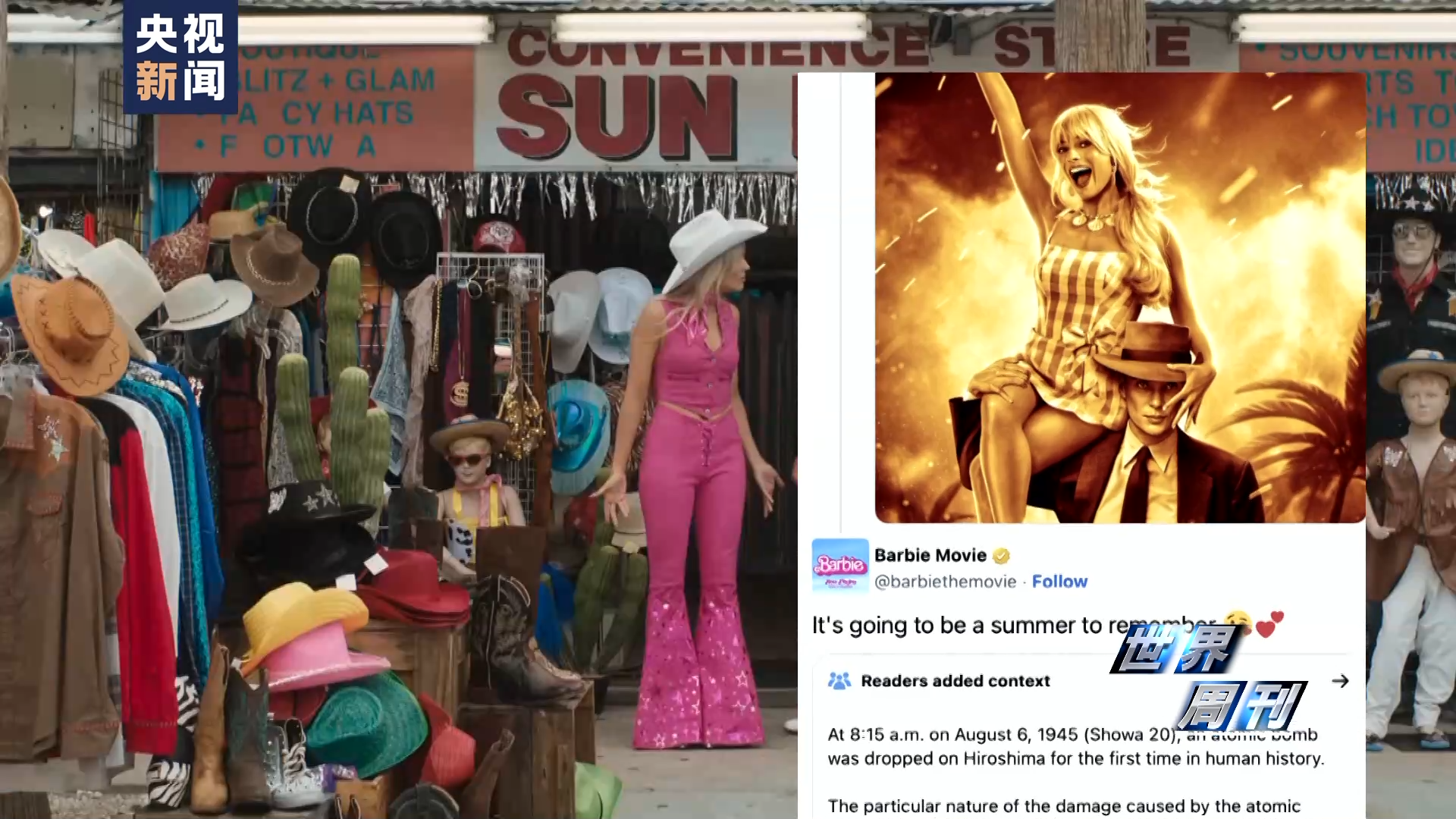 在电影《芭比》的官方社交账号上,芭比和原子弹之父奥本海默被安放在一起,背景是核爆场景。下方的配文称:“这将是一个令人难忘的夏天”。