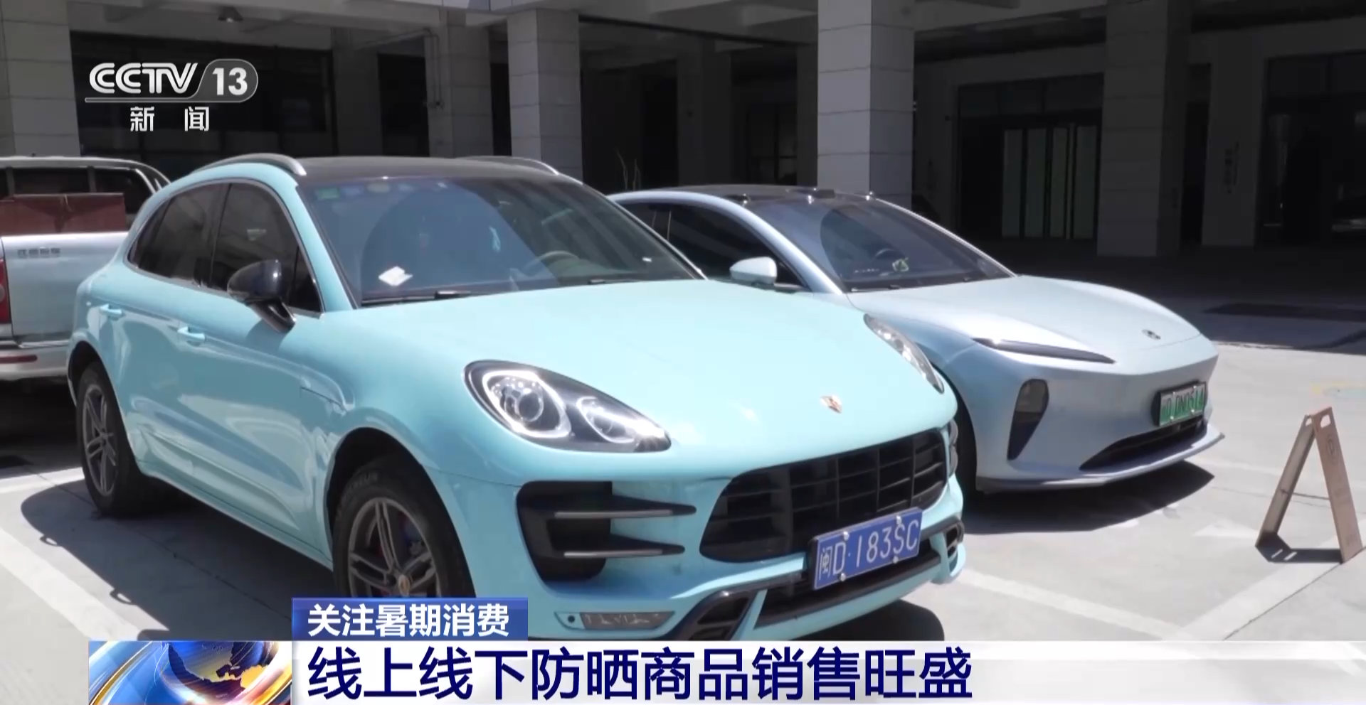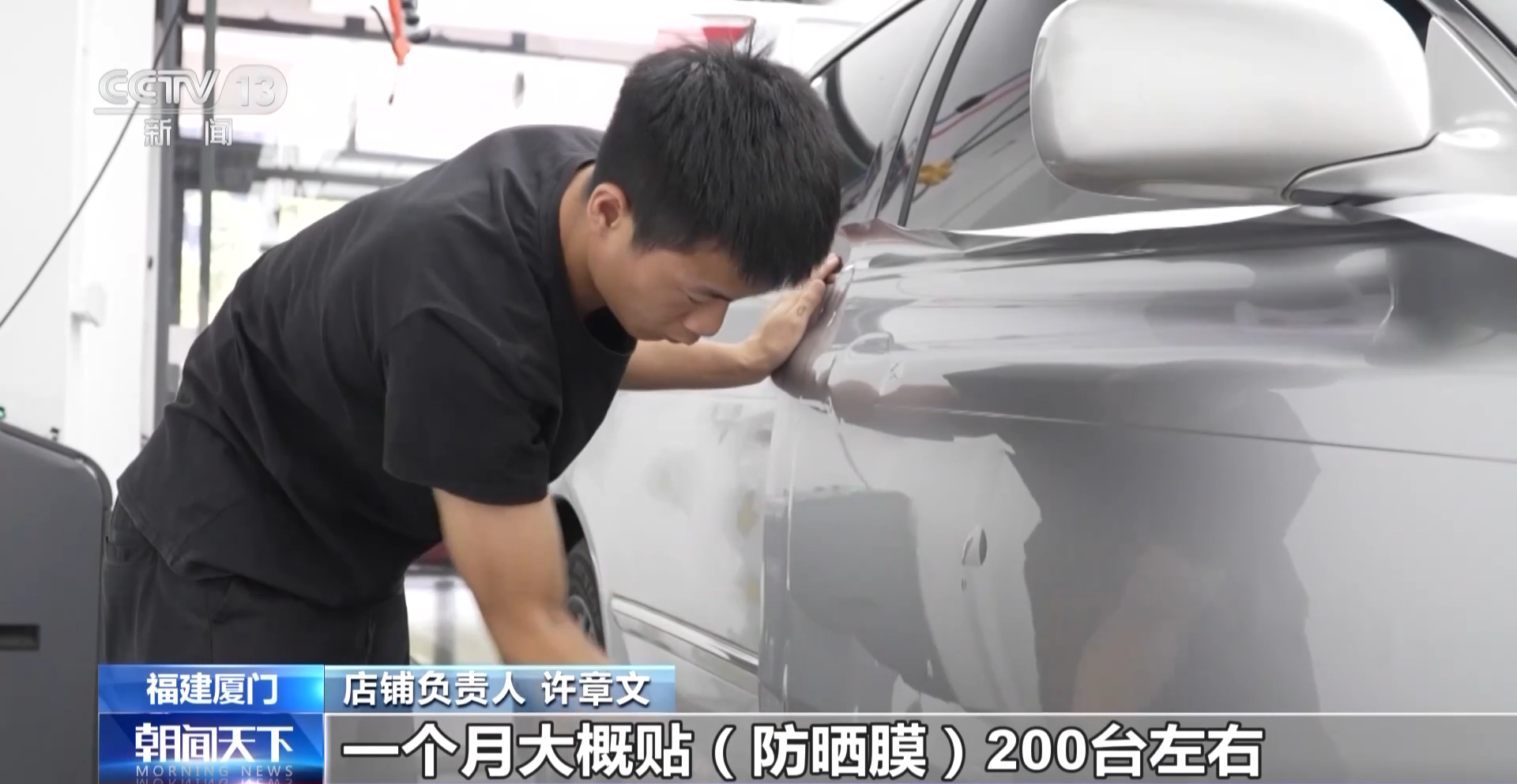 在炎炎夏日里,不少车主也在给自己的爱车防晒。在厦门这家汽车装潢店里,工作人员正忙着清洁车窗,准备为车辆贴防晒膜。门店负责人介绍,进入夏天以来,由于生意火爆,店内的技师也都开启了加班模式。