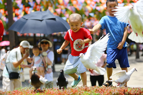 8月5日,小朋友在海南省三亚市南山文化旅游区游玩。新华社发(陈文武 摄)
