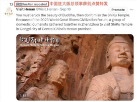 金秋九月,郑州迎来国际盛会——2023世界大河文明论坛(中国·郑州)。9月13日起,河南国际传播中心以“从河而来”为总话题,通过双语海报、Vlog、专访短视频、图文等形式对大会进行全方位报道。相关产品通过HiHenan英文网站、大河网英文频道、省政府英文网站及河南国际传播中心海外社媒账号矩阵发布,屡屡被海内外主流媒体、外交使节等点赞、转发,相关话题多次登上微博热搜。据不完全统计,截至目前,总阅读量超过500万次。