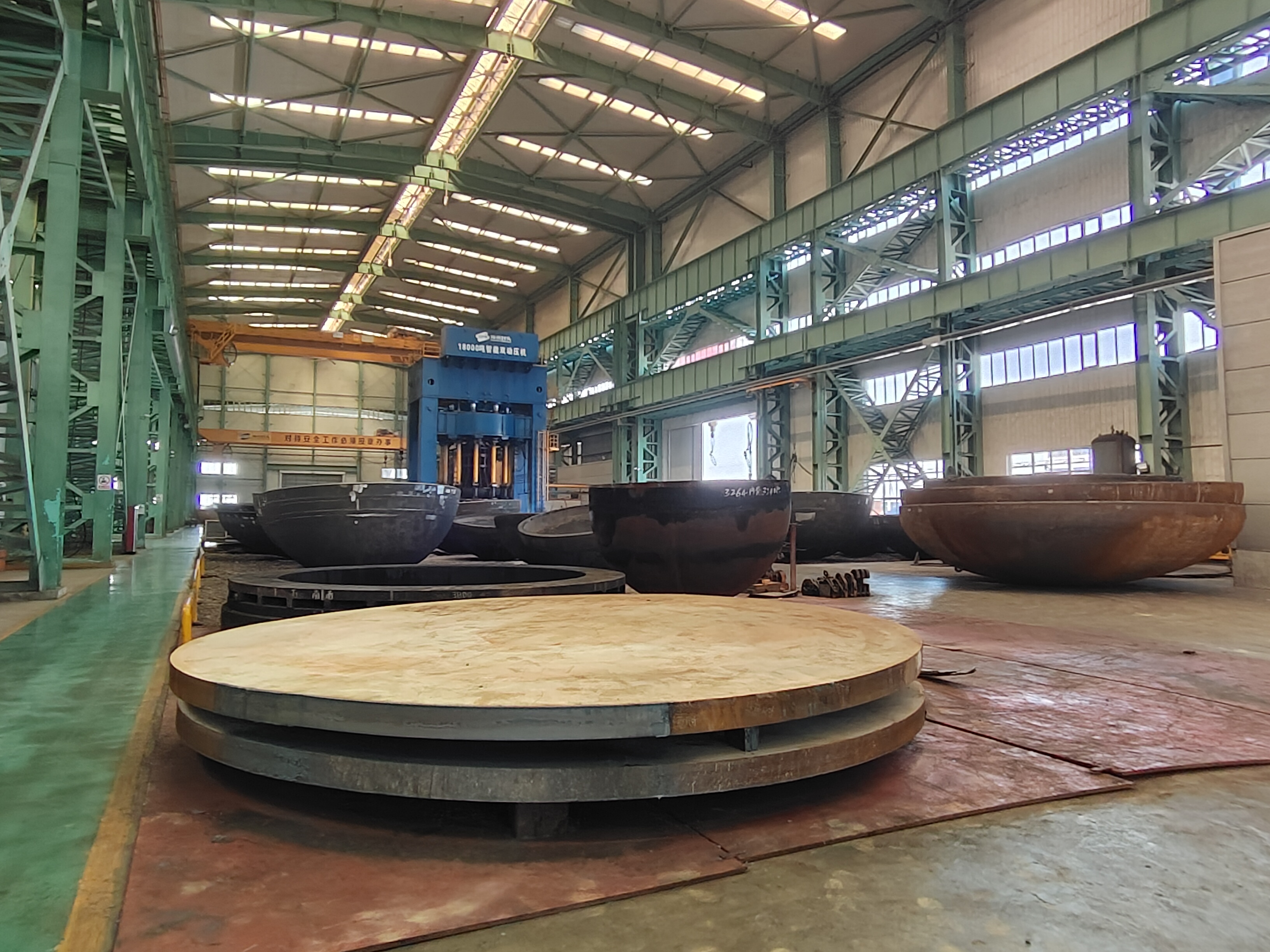 一块块厚重的钢板,经过高温加热到950摄氏度,变得整体通红,然后上机冲压成形状各异的封头成品。落地后,可以在其周围看到浮动着的热气……这是在河南神州精工制造股份有限公司的生产车间里,顶端新闻记者现场看到的景象。