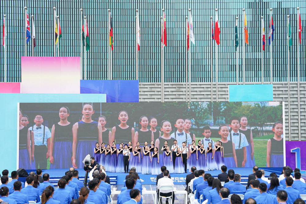 9月16日,杭州亚运会亚运村开村仪式暨中国体育代表团欢迎仪式在亚运村旗帜广场举行。图为小演员们在仪式上合唱杭州亚运会主题歌曲《同爱同在》。新华社记者杜宇摄