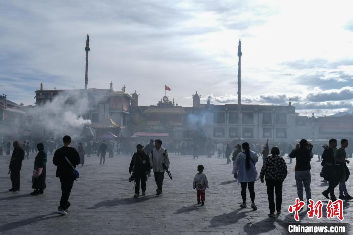 图为9月30日上午,游客、市民在大昭寺广场。当日恰逢转经日,大昭寺、八廓街桑烟氤氲,热闹非常。江飞波 摄