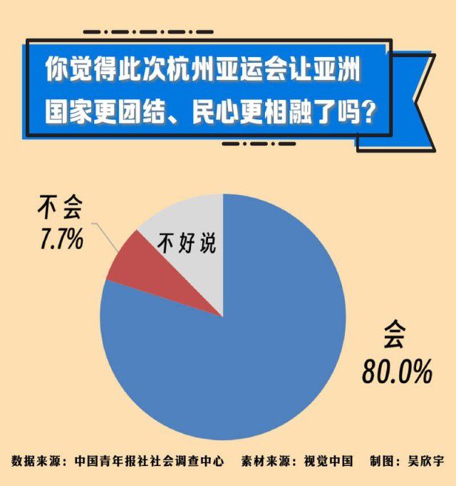 在杭州亚运会进行中,中国青年报社社会调查中心联合问卷网(wenjuan.com),对2001名受访者进行的一项调查显示,80.0%的受访者认为杭州亚运会让亚洲国家更团结、民心更相融了,54.6%的受访者认为杭州亚运会主题曲《同爱同在》唱出了亚洲国家的许多相同之处。