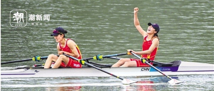 9月24日,在赛艇女子轻量级双人双桨决赛中,杭州姑娘邹佳琪(右)与搭档邱秀萍斩获本届亚运会首金。潮新闻记者 董旭明 摄