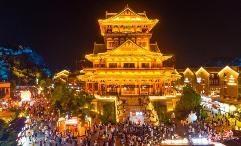 2023年10月4日晚,游客在广西柳州市窑埠古镇龙城阁前游玩。(黎寒池摄/光明图片)