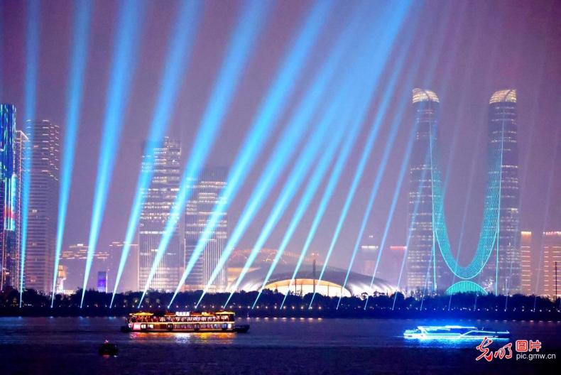 2023年9月28日,杭州市“庆亚运 迎双节”钱江两岸主题灯光秀,绚丽多彩,吸引众多市民游客驻足观看。(周方玲摄/光明图片)