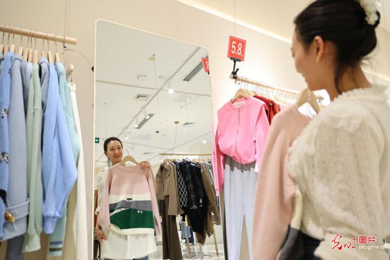 2023年10月1日,在位于重庆市沙坪坝区土主街道的一家综合商超,前来购物的旅客正在挑选服饰。(孙凯芳摄/光明图片)