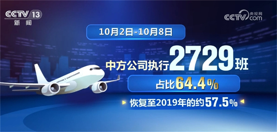 民航局最新数据显示,上周(10月2日—10月8日),中外航空公司执行的国际定期客运航班已恢复至4240班,约为2019年的55.6%;其中中方公司执行2729班,占比64.4%,恢复至2019年的约57.5%;外航执行1511班,占比35.6%,恢复至2019年的约42.5%。